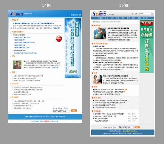 其實友商聯(lián)線15期和14期,在風(fēng)格設(shè)計上是近似的,都是商務(wù)風(fēng)格,簡潔大方,藍(lán)色調(diào)子,右邊為廣告區(qū)域。視覺設(shè)計并沒有新的改觀和體驗。
