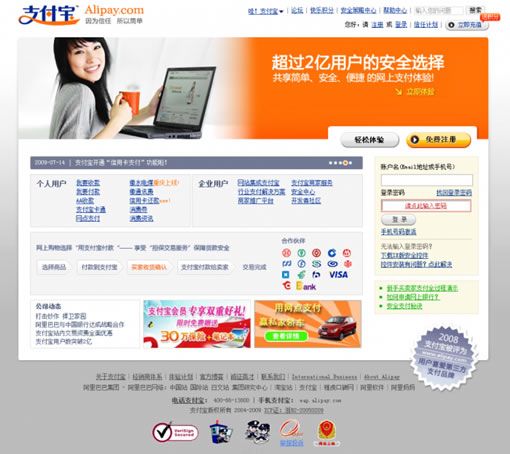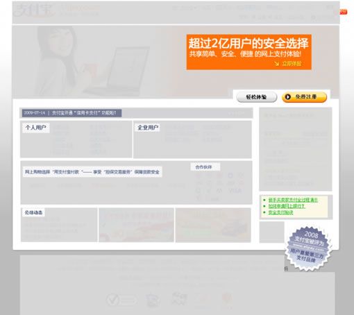 支付寶:大banner分為2塊,左邊是代表著用戶(hù)的大美女,右邊是體現(xiàn)實(shí)力的宣言“超過(guò)2億用戶(hù)的安全選擇”,輔助小字為:共享簡(jiǎn)單、安全、快捷的網(wǎng)上支付體驗(yàn),具有親合力的美女,醒目的大標(biāo)語(yǔ),傳達(dá)給用戶(hù)的信息,支付寶的內(nèi)容構(gòu)思很明顯比財(cái)付通更直接有效。