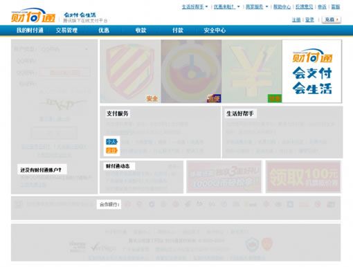財(cái)富通:支付服務(wù)(含個(gè)人和企業(yè)),生活好幫手,還沒(méi)有財(cái)富通帳戶(hù),支付好幫手,合作銀行,共5塊主要內(nèi)容,兩個(gè)廣告區(qū)。