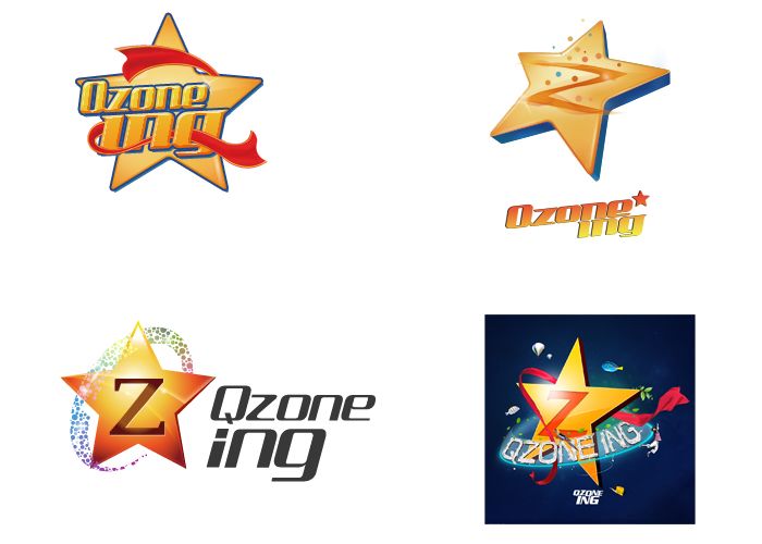 從設(shè)計(jì)師完成的幾款logo初稿中驚喜的發(fā)現(xiàn),構(gòu)思和元素選取上有異曲同工之意??臻glogo中的五角星,星球和代表”Qzone”的Z被從新表現(xiàn)和詮釋不同的氣質(zhì)。加之彩帶,光環(huán)和歡慶的元素的結(jié)合表現(xiàn)著慶典主題logo的歡慶氛圍。