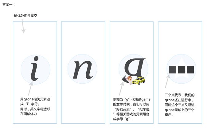 在構(gòu)思logo的設(shè)計(jì)時(shí),首先把現(xiàn)有的能代表空間元素和發(fā)散想象的與活動(dòng)主題相關(guān)的元素都羅列出來,比如空間固有元素星球、五角星、代表”Qzone”的Z;結(jié)合活動(dòng)主題構(gòu)想的元素有文字“Qzoneing”、彩帶、光環(huán)、皇冠等等;接下來就是這些關(guān)鍵詞視覺化并相互碰撞組合成新的圖形。把覺得滿意的構(gòu)思從草圖中篩選處理進(jìn)行繪制。