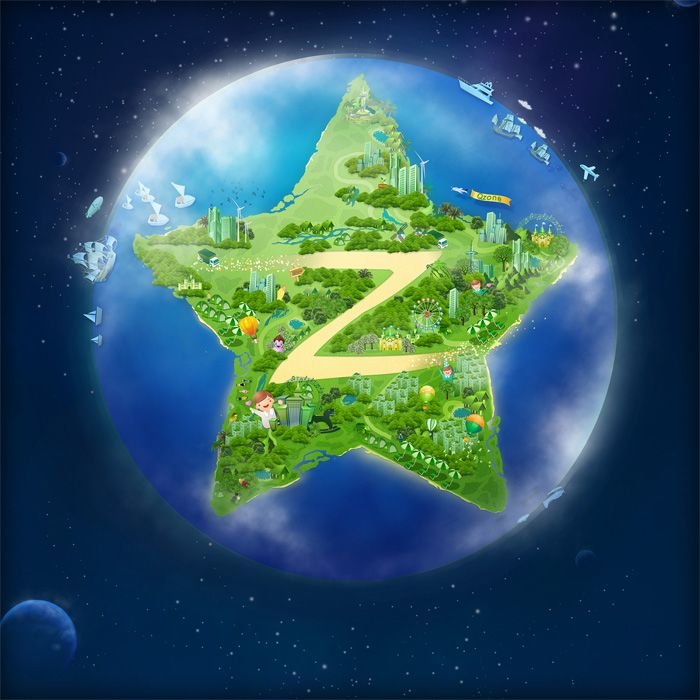 這樣的表現(xiàn)形式得到了大家一致認(rèn)同,不過“ing…”代表什么意思吶?恐怕很難讓人馬上理解。形式很好,內(nèi)容需要優(yōu)化!因此我們沿著這個(gè)方向發(fā)散,從內(nèi)容上考慮新的表現(xiàn)。就這樣地球村的想法孕育而出??臻gSNS平臺(tái)聯(lián)系著千萬用戶,我們?cè)诳臻g里寫日志、貼照片、停車、種水果、買賣好友…地球村這不正好是Qzone最好的表達(dá)嗎?想法出爐后,時(shí)間緊迫,熬夜是必然了。星球、綠地、樹、房子、道路,地球村漸漸有了模樣。