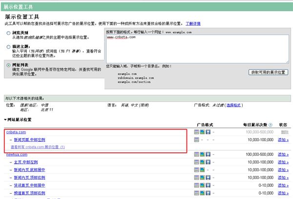 我已經(jīng)知道我的客戶群體會(huì)經(jīng)常會(huì)訪問(wèn)哪些網(wǎng)站,我該如何選擇這些站點(diǎn)?使用谷歌ADWORDS展示位置工具,輸入您所知道站點(diǎn)的域名,即可顯示出匹配的站點(diǎn)列表,加入此站點(diǎn)和其它匹配的相關(guān)站點(diǎn)即可!