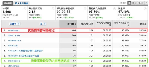 我們可以通過(guò)幾個(gè)重要指標(biāo)來(lái)評(píng)估內(nèi)容站點(diǎn)的質(zhì)量(平均停留時(shí)間、跳出率、KPI轉(zhuǎn)換率),排除流量質(zhì)量和KPI轉(zhuǎn)換效果較差的站點(diǎn),添加新的相關(guān)內(nèi)容網(wǎng)絡(luò)站點(diǎn)。不斷執(zhí)行優(yōu)化的過(guò)程中,您可能會(huì)驚喜的發(fā)現(xiàn)您的廣告投資回報(bào)率在不斷增長(zhǎng)。 如果您的Google Adwords帳戶已經(jīng)和谷歌分析(Google Analytics)帳戶鏈接整合,那么您可以通過(guò)谷歌分析報(bào)表數(shù)據(jù),分析出以網(wǎng)站定位廣告系列中的所有站點(diǎn)的質(zhì)量。