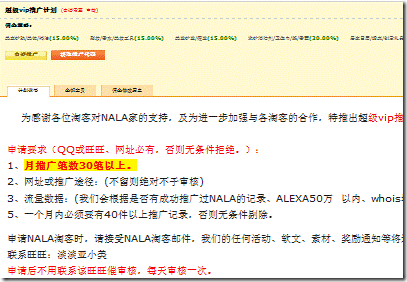 這個(gè)計(jì)劃一定要是審核的,而且審核時(shí)要高要求,要嚴(yán)格。比如我們,月推廣30單以上,才可以申請(qǐng),每月定期審核,月推廣沒(méi)達(dá)到40單的,清理出去。申請(qǐng)時(shí),沒(méi)達(dá)到標(biāo)準(zhǔn)的,我們會(huì)請(qǐng)他去申請(qǐng)其他計(jì)劃。要保證這個(gè)VIP計(jì)劃確實(shí)是高標(biāo)準(zhǔn)的,特別為獎(jiǎng)勵(lì)大淘客去設(shè)置的。