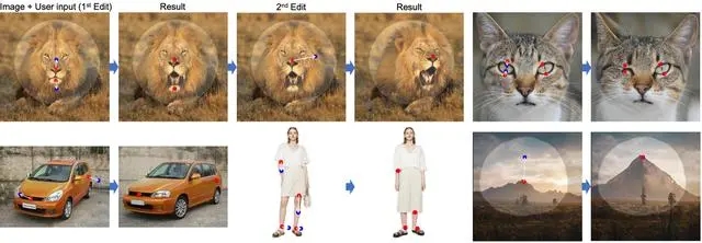 1. 基于點的編輯:DragGAN允許用戶通過在屏幕上拖動和放置點來直接更改圖像。這可以實現(xiàn)比傳統(tǒng)圖片編輯軟件更準(zhǔn)確和逼真的調(diào)整。